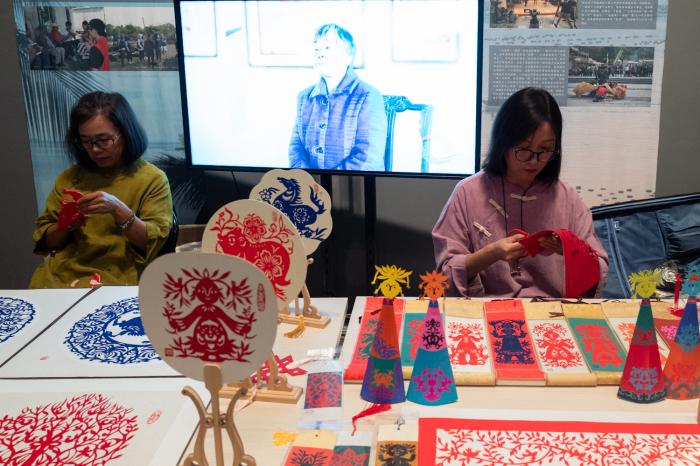 医巫闾山满族剪纸传承人秦晓玲、蔺心宇用纸与剪刀勾勒出满族图腾与民俗故事。