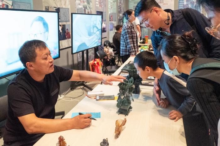 阜新玛瑙雕刻技艺传承人刘洪亮展示了龙纹链条炉、龙首杯、仿莲鹤方壶等素活作品。