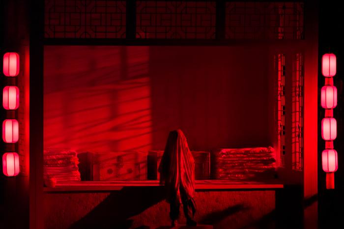 舞美设计季乔选取“红高粱”作为核心视觉元素,一片矩阵构成的“高粱墙”随剧情生长、摇曳,一抹红色渲染其上。