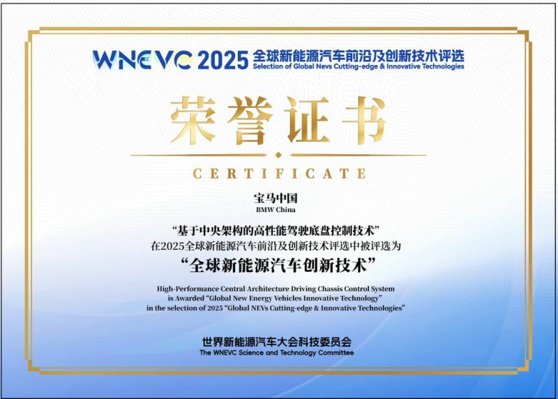 9月28日,在2025世界新能源汽车大会(WNEVC)上,宝马自主研发的“基于中央架构的高性能驾驶底盘控制技术”,即新世代“驾控超级大脑”,再度荣获“全球新能源汽车创新技术”证书。这也是宝马集团第五次在该大会上获评,同时也是唯一连续四年获得该证书的外资车企。