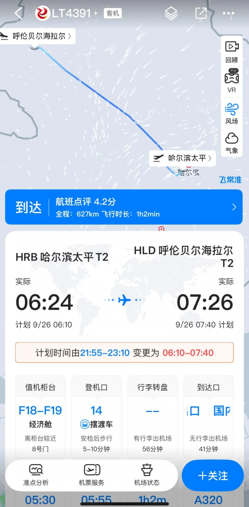 据飞常准数据显示,LT4391航班起飞计划时间由26日21:55调整至6:10。该航班实际于26日6:24起飞,于7:26抵达呼伦贝尔海拉尔。