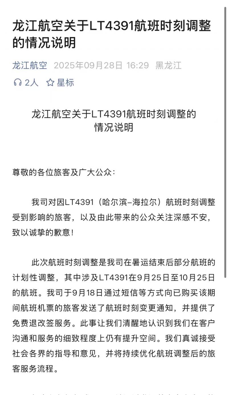 龙江航空方面解释说,此次航班时刻调整是该司在暑运结束后部分航班的计划性调整,其中涉及LT4391在9月25日至10月25日的航班。该司于9月18日通过短信等方式向已购买该期间航班机票的旅客发送了航班时刻变更通知,并提供了免费退改签服务。“此事让我们清醒地认识到我们在客户沟通和服务的细致程度上仍有提升空间。我们真诚接受社会各界的指导和意见,并将持续优化航班调整后的旅客服务流程。”