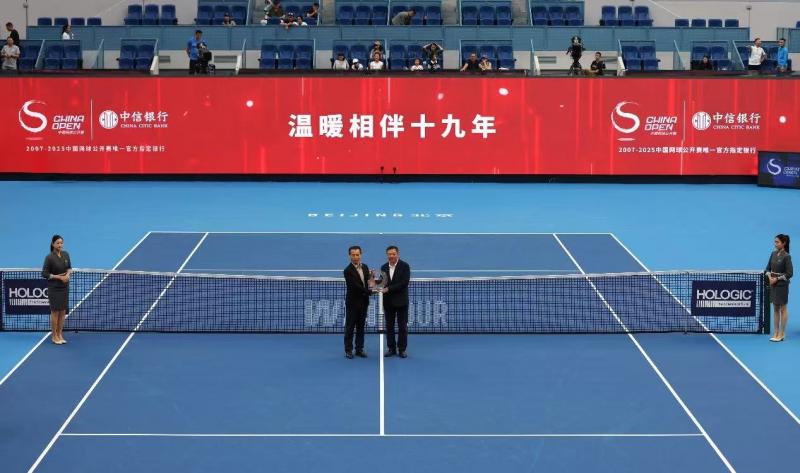 2025中国网球公开赛在国家网球中心激战正酣,9月28日下午的首创钻石球场内迎来2025年中网“中信银行主题日”。2025中国网球公开赛组委会秘书长陈杰出席活动,并现场向中信银行代表颁发纪念奖盘和证书,感谢中信银行作为中网顶级赞助商,连续19年与赛事携手同行,共同见证中网和中国网球事业的发展。