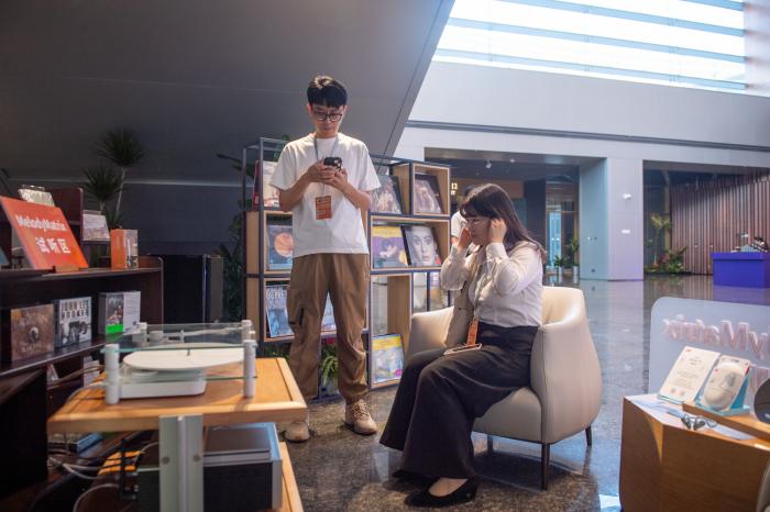音博会现场,观众在工作人员的引导下进行试听。