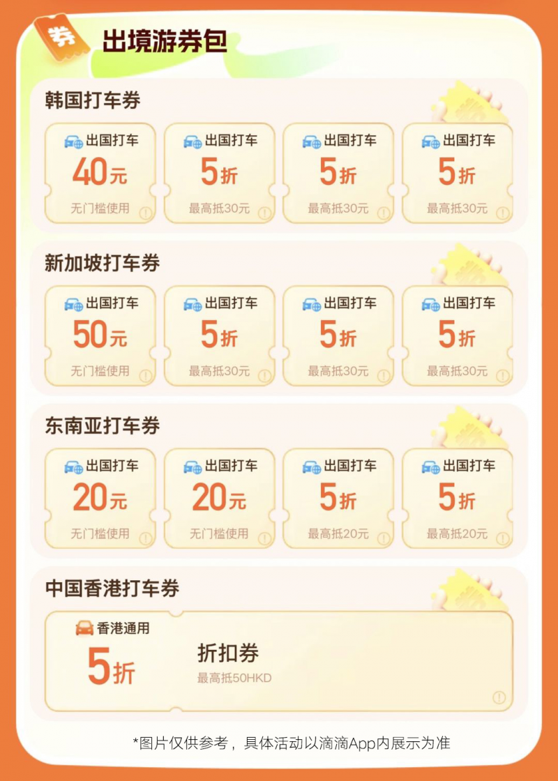 国庆假期期间,用户打开滴滴App或小程序进入海外出行活动页面,可领海外打车专属券包:在韩国打车单次最高减40元;在新加坡打车单次最高减50元;在东南亚其他国家打车单次最高减20元。在澳大利亚、新西兰、日本打车也有相应优惠,用户可进入活动页面查看具体优惠详情。先领券再出发,打车省钱又方便。
