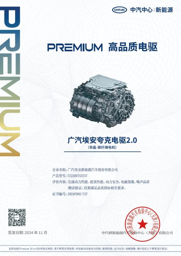 广汽夸克电驱2.0非晶-碳纤维电驱荣获中汽研首批“Premium高品质电驱”认证