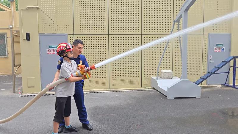 最让郅家诚兴奋的是体验环节。在消防员的保护下,郅家诚穿戴上重达20多公斤的灭火防护装备,背上空气呼吸器,进行爬楼体验,真实感受消防员日常出警和训练。“这比我想象的要重得多,消防员叔叔穿着这么重的装备还要跑步前进,真是太不容易了。”郅家诚感慨地说。随后,父子二人还共同体验了消火栓出水操作,在消防员指导下掌握了正确的持枪姿势和水带铺设技巧。