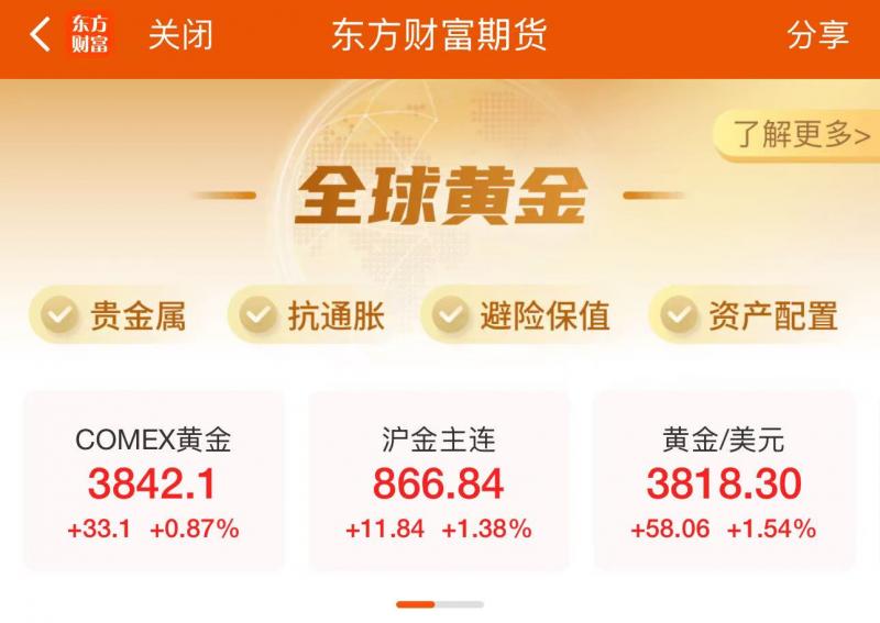 而本周一,现货黄金价格突然大幅攀升。截至发稿时,现货黄金已经涨超1.5%,最高报3819.8美元/盎司。同时,COMEX黄金期货周一也由跌转涨,涨幅接近1%,最高报3848.8美元/盎司。
