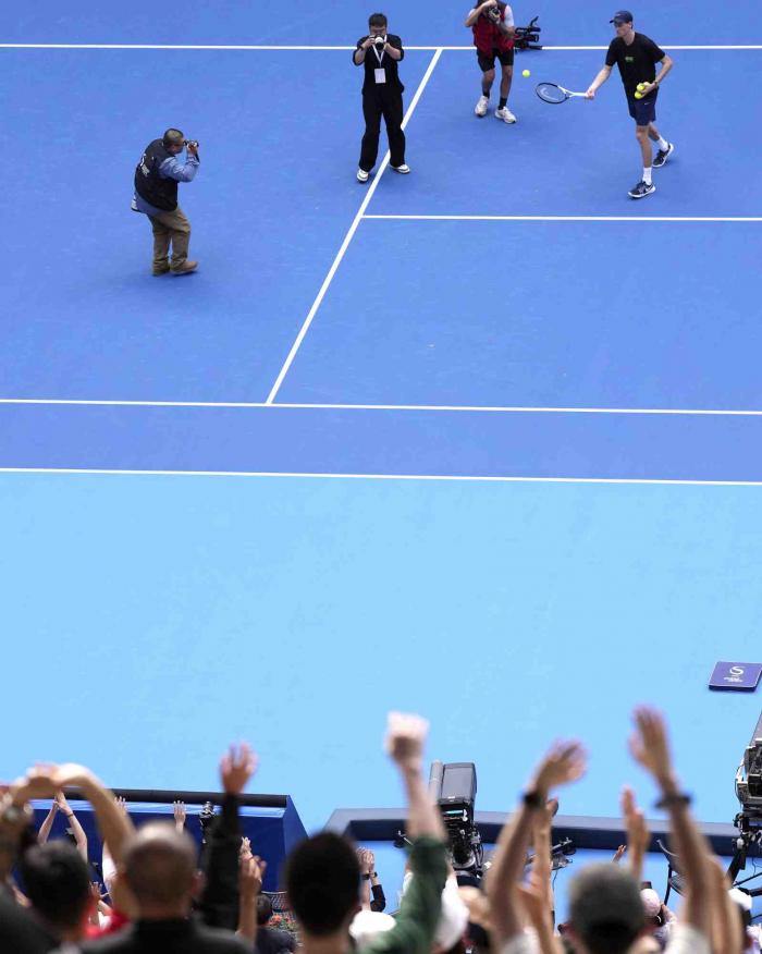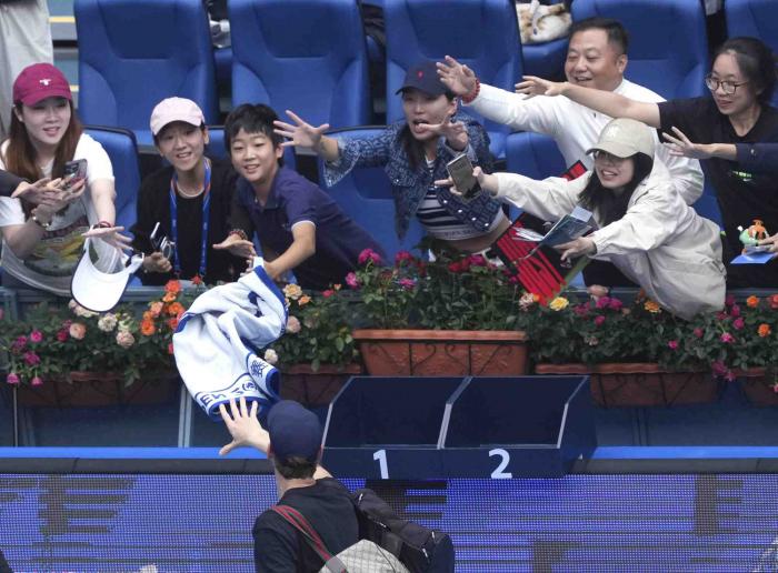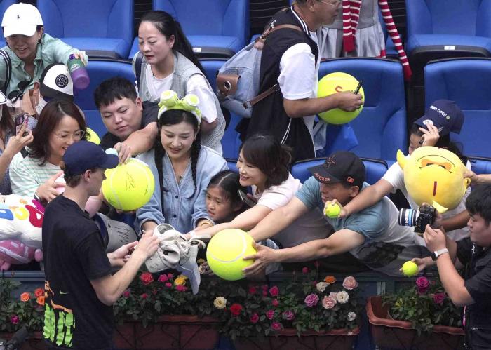 辛纳取胜后向观众赠送网球。