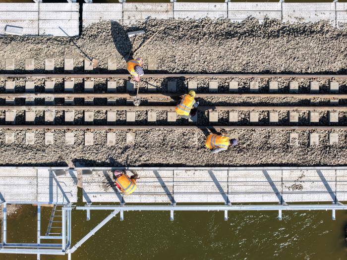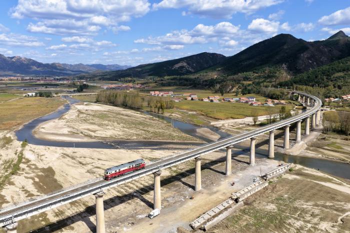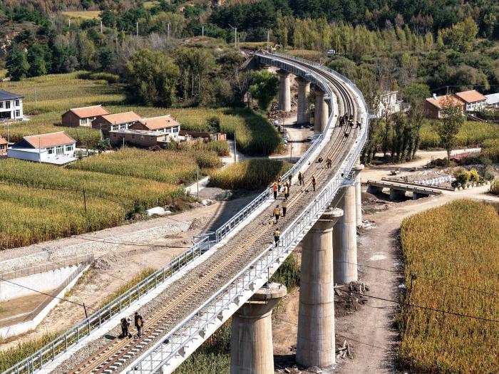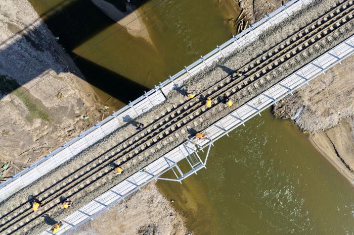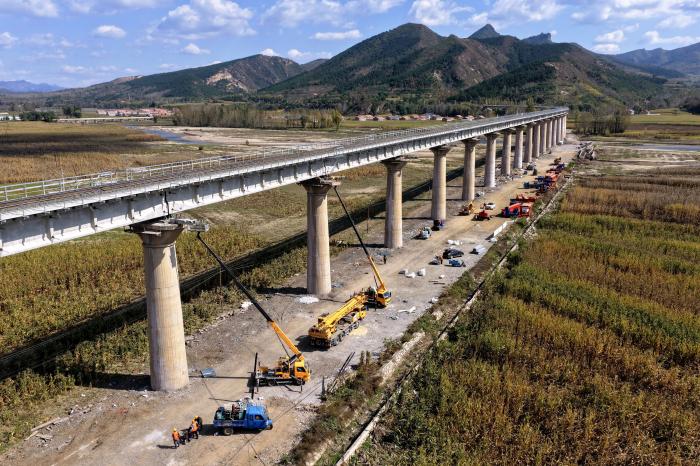 该工程对既有线的7座桥梁进行拆除更换,是京通铁路最大规模的换梁工程,为京通铁路列车实现全面提速奠定坚实基础。9月28日,工人在京通铁路河北隆化段施工(无人机照片)。
