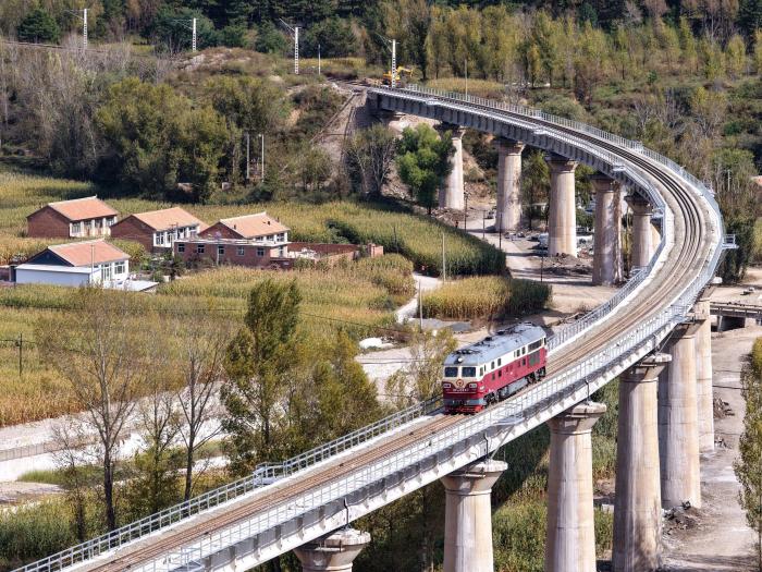 9月28日,列车驶过京通铁路河北隆化段(无人机照片)。