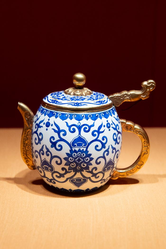 法国18世纪画珐琅白地蓝花壶。此壶是粤海官员奉乾隆皇帝敕命,依照“雍正年制款铜胎画珐琅壶”原物画图样后,委托法国工匠仿制而成。