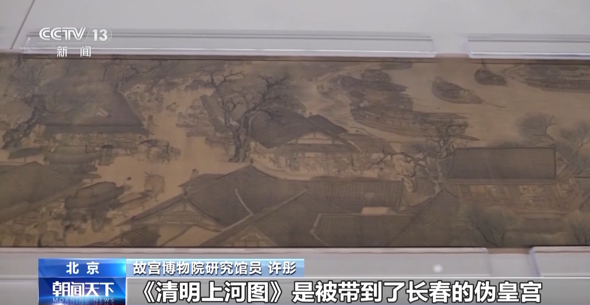 故宫博物院研究馆员 许彤:2025年百年院庆的时候,《清明上河图》再次出现,充分结合了跟院史的关系,随着1923年溥仪出宫,有大量的文物也随之散逸。《清明上河图》是被带到了长春的伪皇宫,在1945年解放军在通化这个地方把它缴获,在1958年又通过国家,收藏于故宫博物院,举国之力让这件这么重要的国宝,今天能够展示在故宫博物院。