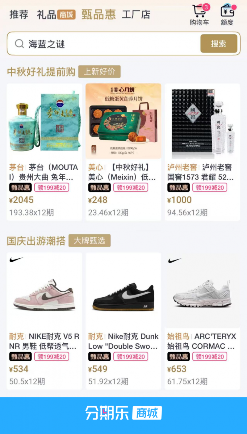 针对双节期间两大核心消费场景——中秋团聚送礼与假期出行,分期乐商城依托 “甄品惠” 模式搭建主题消费场景,精准匹配消费需求。“中秋好礼提前购” 活动聚合酒水、食品、礼品等品类的热门大牌,包括高端白酒、进口红酒、茶叶、大牌月饼礼盒、大闸蟹等均可享受分期购买优惠,满足不同圈层的送礼需求,助力消费者传递节日心意;“国庆出游潮搭” 活动则聚焦秋装鞋服、户外装备等品类,为出行用户提供一站式采购方案。