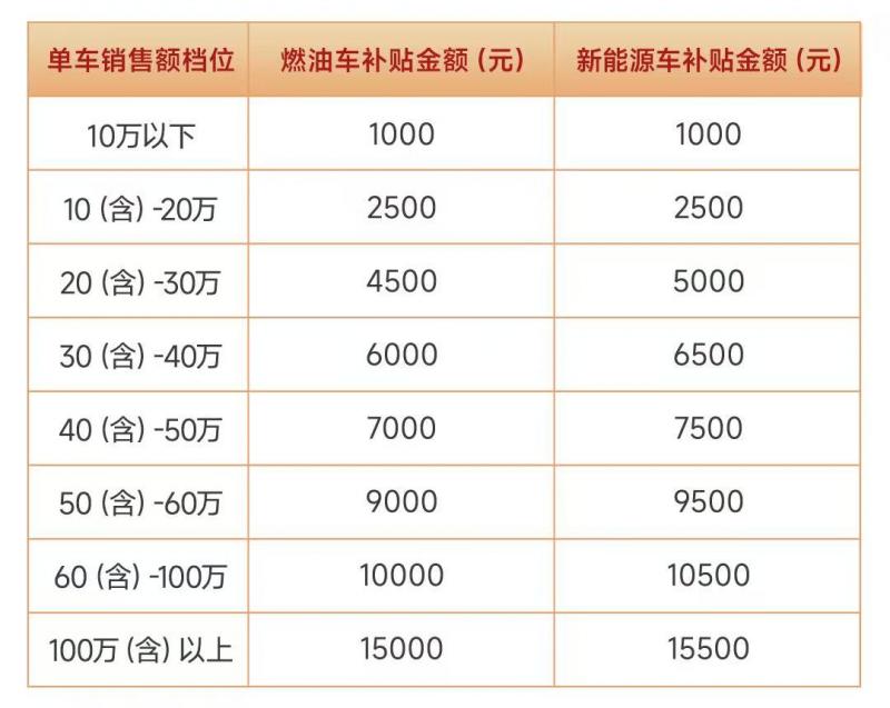 本次补贴以机动车销售统一发票所载明的单车售价价格为准,具体标准如下,燃油车价格补贴标准:10万元以下,每台车补贴1000元;10(含)-20万元,每台车补贴2500元;20(含)-30万元,每台车补贴4500元;30(含)-40万元,每台车补贴6000元;40(含)-50万元,每台车补贴7000元;50(含)-60万元,每台车补贴9000元;60(含)-100万元,每台车补贴10000元;100万元(含)以上,每台车补贴15000元。新能源车额外补贴:符合国家标准的新能源车(含插电式混合动力、增程式电动汽车、纯电动车、燃料电池电动车),除享受上述对应区间的燃油车补贴标准之外,若每辆车售价在20万元(含)以上,每台额外补贴500元。