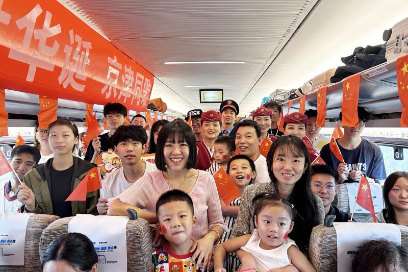 为让出行旅客在旅途中也能欢度国庆,部分列车精心策划了主题活动。上午,由中国铁路北京局天津客运段组织的“盛世华诞 京津同歌”主题活动,在天津开往北京南的C2218次列车上温情上演。“今天是国庆节,诚邀各位旅客与我们一起唱响《歌唱祖国》,向祖国致以祝福!”手持小国旗的乘务员向车厢旅客发出热情邀请,熟悉的旋律随即在车厢内奏响。