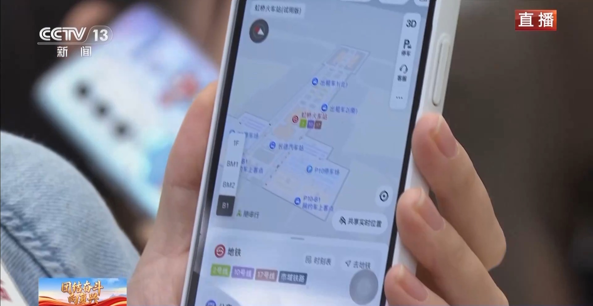 虹桥站面积大,层数较多,为提升旅客出行体验,手机端首次上线“室内导航”功能,通过精准的定位技术,系统会自动推荐从当前位置出发的精准路线,避免绕路或找不到地方。系统还支持实时共享不同楼层的位置,非常方便。