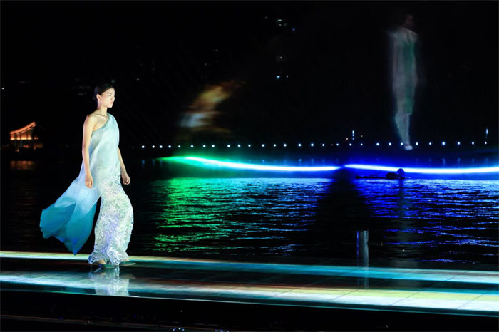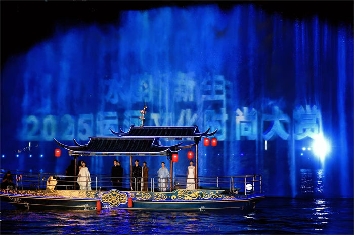 水上T台也沿着运河铺展开来,伴随交响乐的旋律,模特踏上T台,步态流转间,LED地屏的粼粼波光随节奏起伏,让整个秀场宛如“坠入星河的运河幻境”,每一步都踩着古今交融的韵律,让运河文化在声光交织里鲜活起来。据悉,作为活动的压轴大戏,80余套运河主题原创服装由全国十佳设计师团队操刀,以“芳华流韵、澄莹之境、朝暮流金、新帆启梦”四大篇章,织就运河文化与当代时尚的浪漫交响。