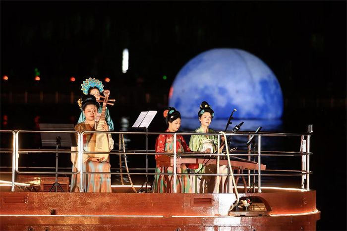北京青年报记者在现场看到,活动打破传统秀场的固定边界,将运河水域化作天然舞台,让观众一入场便坠入运河的千年梦境。核心水域之上,琵琶船浮于碧波中央,“二十四伎乐”在此奏响国风音律,呈现“水为琴弦,舟影成谱”的奇妙意境,水面漾开“蓝水滴”似的荧光,恍若银河倾落运河。满载模特的演艺船从远处缓缓驶来,华服与水光相映,此刻的运河,既是展示时尚的舞台,更是讲述千年漕运故事的载体。