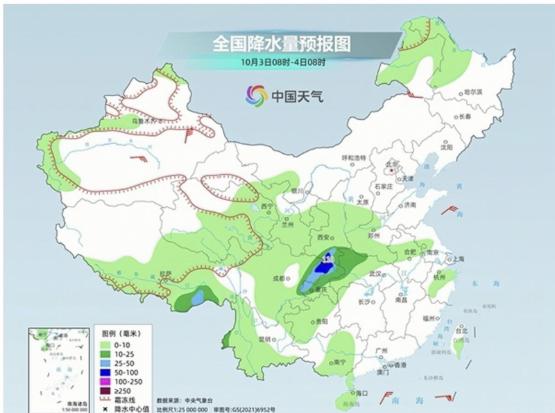 今起三天(10月2日至4日),华西至黄淮一带依然阴雨连连,四川、陕西、河南等地部分地区累计雨量大,需警惕暴雨致灾。同时,华北、东北多地暖热持续,江南、华南有持续性高温天气。