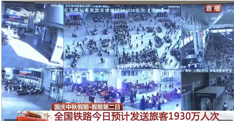 与昨天全国铁路出行高峰相比,今天国内各大高铁站客流热度依然不减,整体仍处于高位运行。国铁集团刚刚发布数据显示,今天,全国铁路预计发送旅客1930万人次。10月1日,全国铁路发送旅客2313.2万人次,创单日旅客发送量历史新高。