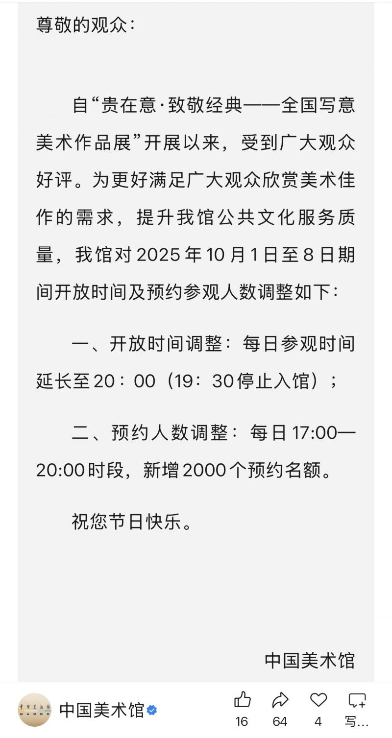 据悉,观众可提前通过官方渠道预约名额,在结束观展后,还能顺带探访周边胡同的市井烟火,让艺术体验与城市气息相融。这个黄金周,中国美术馆的夜游项目不仅是展览空间的延伸,更是一次让经典“活”在当下的生动实践,让每个走进夜色的观众都能收获属于自己的艺术感悟。