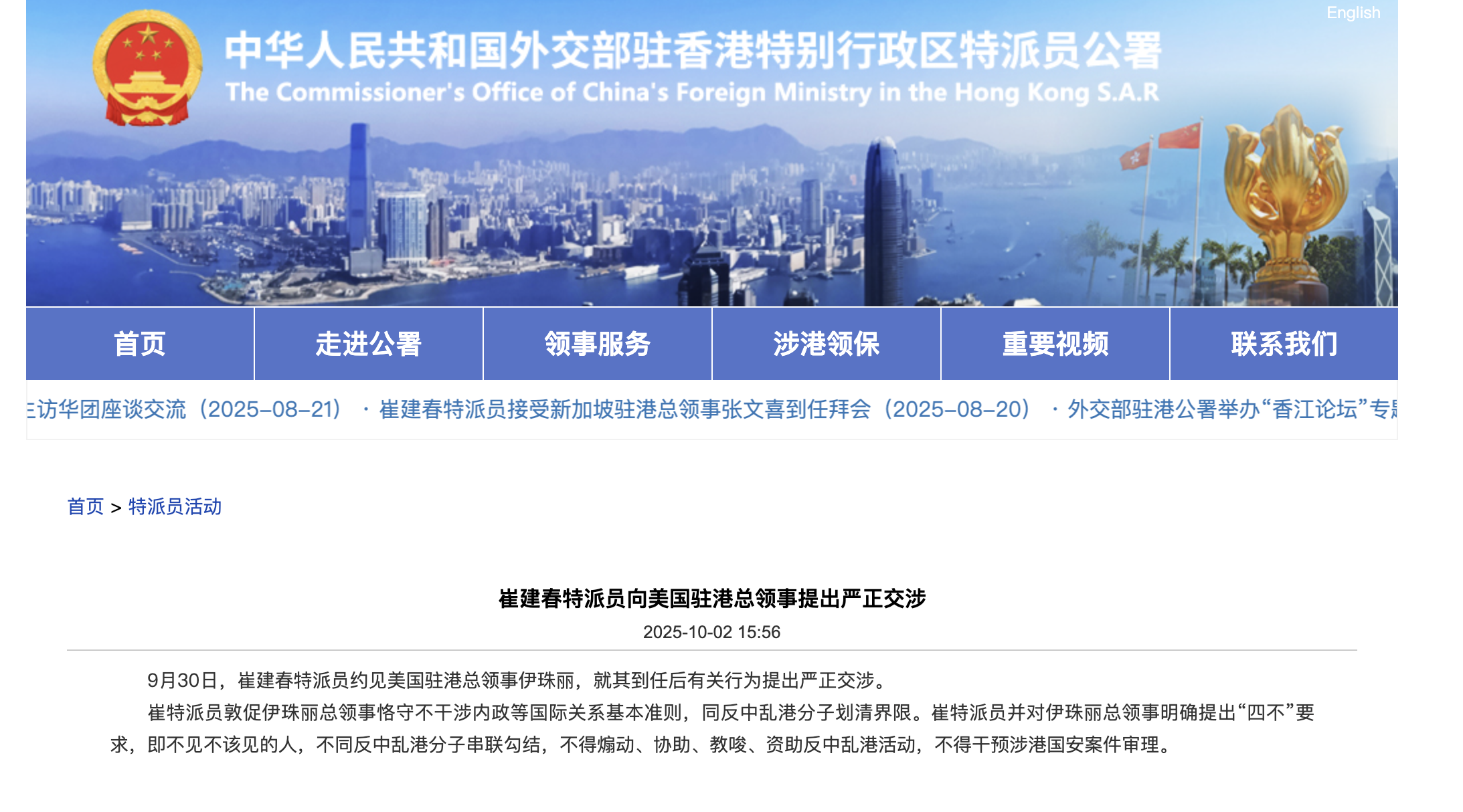 10月2日,外交部驻香港特别行政区特派员公署网站发文:《崔建春特派员向美国驻港总领事提出严正交涉》,全文如下——
