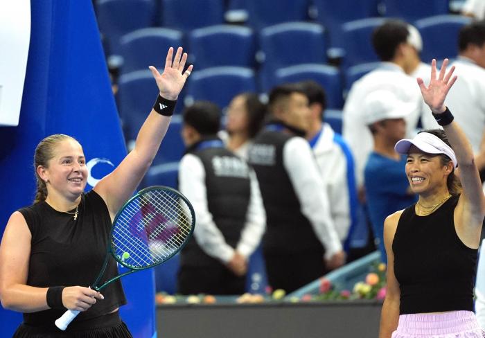 谢淑薇/奥斯塔彭科在获胜后向观众致意。