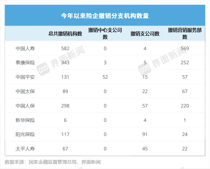 同样“大刀阔斧”的还有中国人保。今年以来,中国人保总共撤销298个分支机构,其中营销服务部裁撤220个,支公司裁撤57个。而2024年全年这一数字不足170。