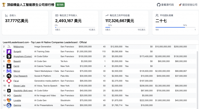 在海外,一份“顶尖精益AI 原生公司”的榜单颇受关注,该榜单长期追踪团队规模较小、但营收可观的初创公司,以衡量我们距离“一人十亿美元”创业现实还有多远,在榜单中,44家公司的平均团队规模为27人,但年度总收入达到近38亿美元,单个员工的估值超过1亿美元。