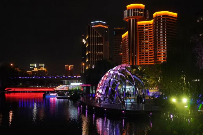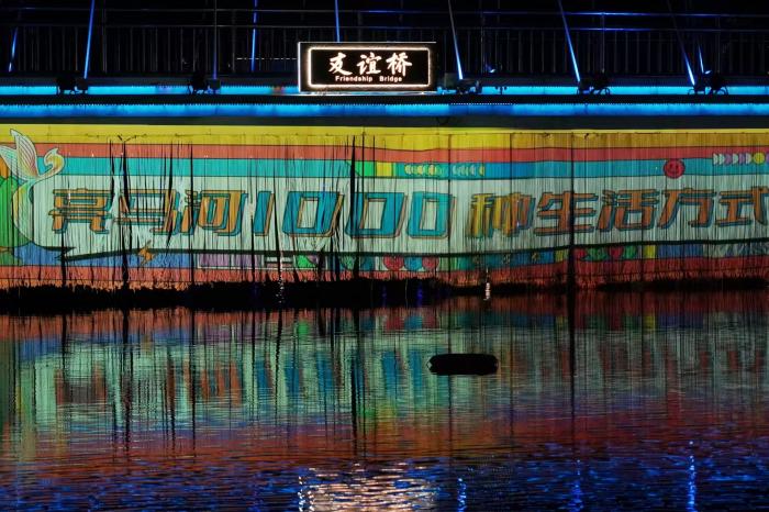 亮马河片区以“盛耀星河”为主题,推出包括水上漂浮舞台“魔方”及楼体Mapping秀在内的文化与科技融合的互动演出。