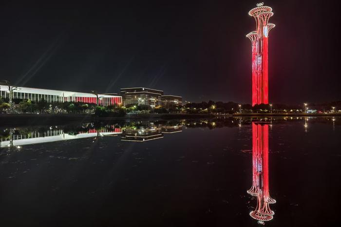 夜色漫过街头,奥林匹克塔换上“中国红”华服,“热烈庆祝中华人民共和国成立76周年”“祝福祖国”“欢度国庆”的字样与光影幻化的绸带、礼花、和平鸽以及娇艳的牡丹、月季交织,缓缓铺展开一幅璀璨的国庆画卷。