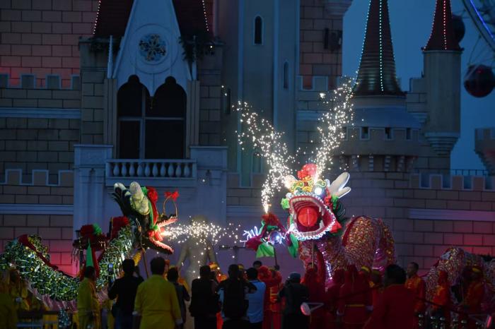下午18:00,伴随激昂鼓点,22米长的雌雄纸龙从灰姑娘城堡出发巡游。