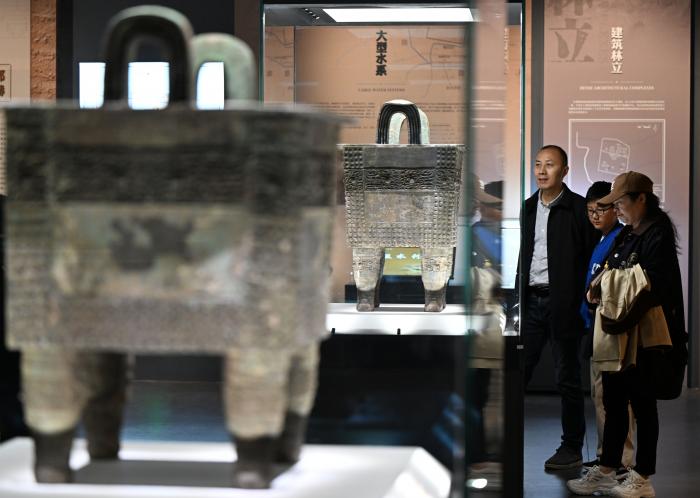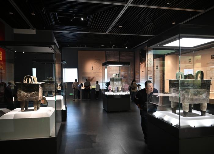 10月3日,游客在郑州商代都城遗址博物院“国宝回家乡——纪念郑州商城发现70周年考古新发现展”上参观杜岭一号方鼎。新华社记者 李嘉南 摄
