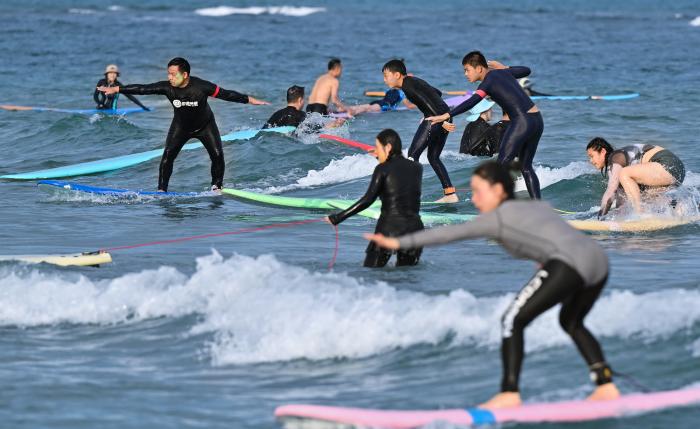 10月2日,游客在海南万宁日月湾冲浪。新华社记者 郭程 摄
