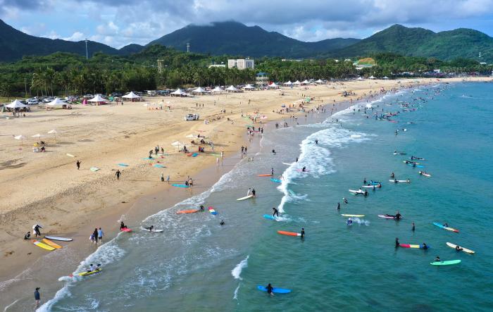 10月2日,游客在海南万宁日月湾冲浪(无人机照片)。新华社记者 郭程 摄