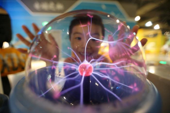 10月3日,小朋友在江苏扬州科技馆体验“辉光球”。新华社发(孟德龙 摄)