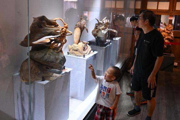 10月2日,游客在福州三坊七巷内参观木雕展品。新华社记者 姜克红 摄