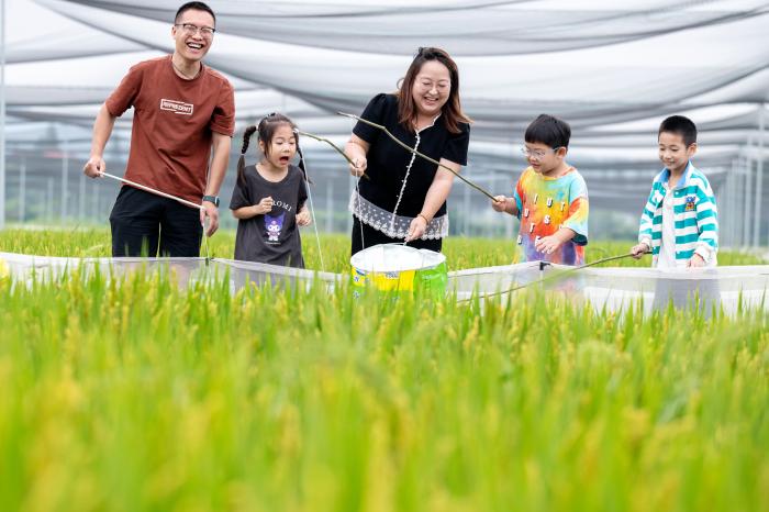 10月3日,游客在浙江省湖州市长兴县夹浦镇的“稻蛙共生”循环生态种养基地体验垂钓。新华社发(谭云俸 摄)