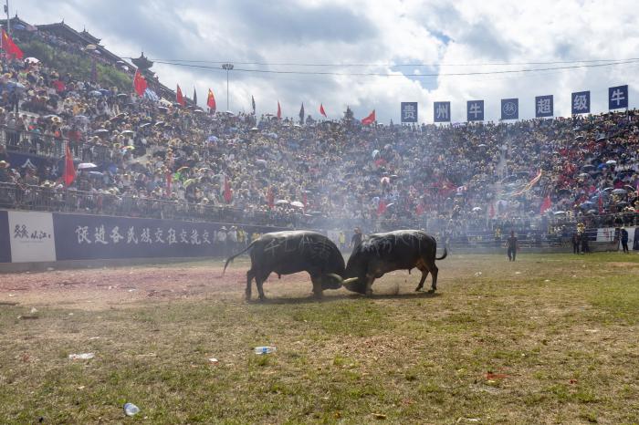 10月2日,观众在贵州省黔东南苗族侗族自治州从江县丙妹镇松学斗牛塘观看斗牛。新华社发(吴德军 摄)