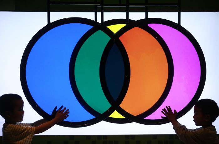 10月3日,小朋友在江苏扬州科技馆体验“三原色的减法原理”。新华社发(孟德龙 摄)