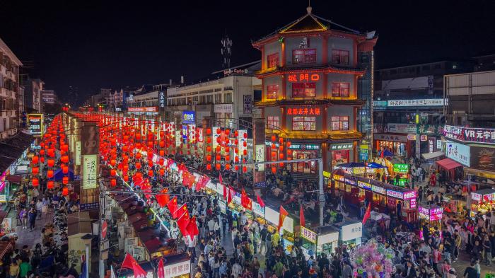 10月2日夜,河南省洛阳市老城区十字街游人如织(无人机照片)。新华社发(李卫超摄)