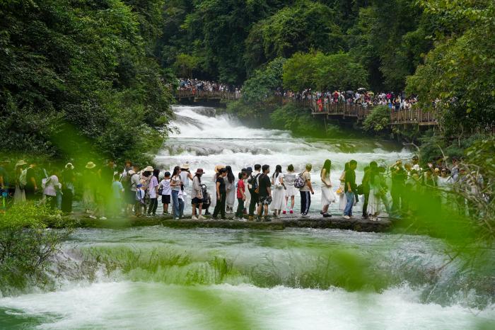 10月3日,人们在贵州省黔南布依族苗族自治州荔波县小七孔景区观光游玩。新华社发(龙建睿摄)