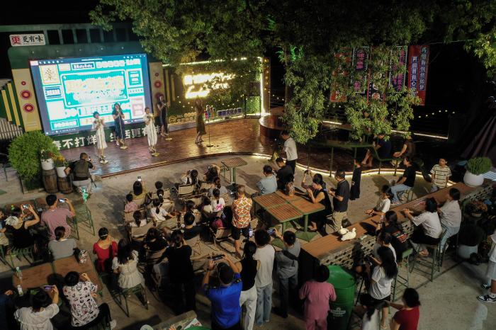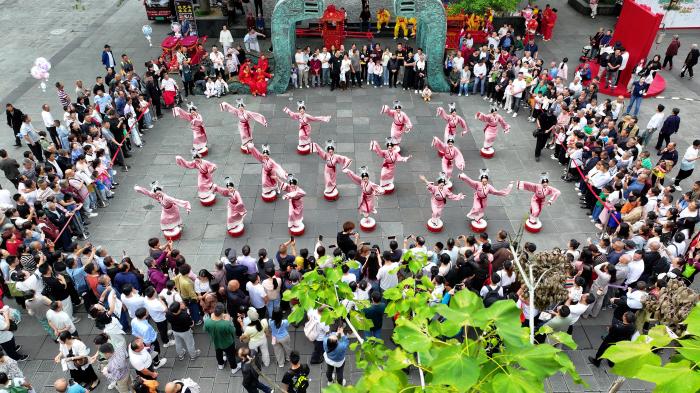 10月3日,游客在浙江省建德市更楼街道更化创意社区内观看表演(无人机照片)。新华社记者 徐昱 摄