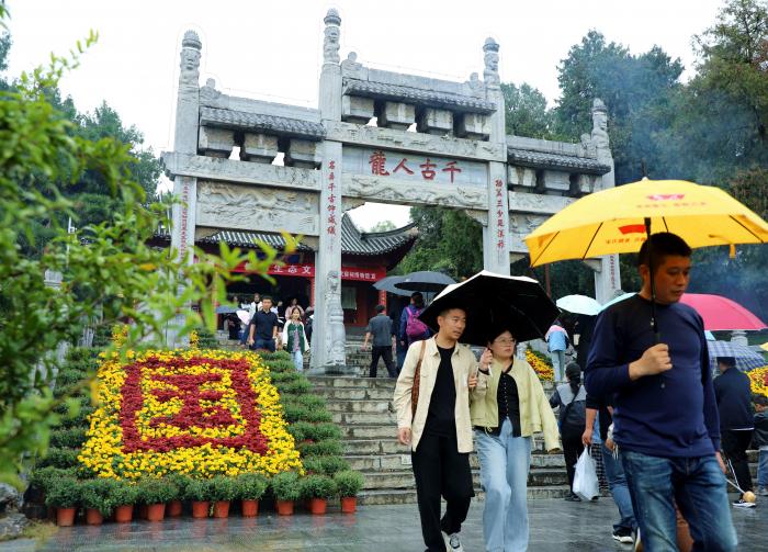 10月3日,在河南省南阳武侯祠博物馆,游客冒雨参观游玩。新华社发(高嵩摄)