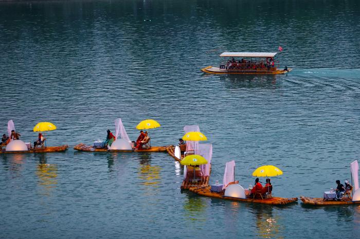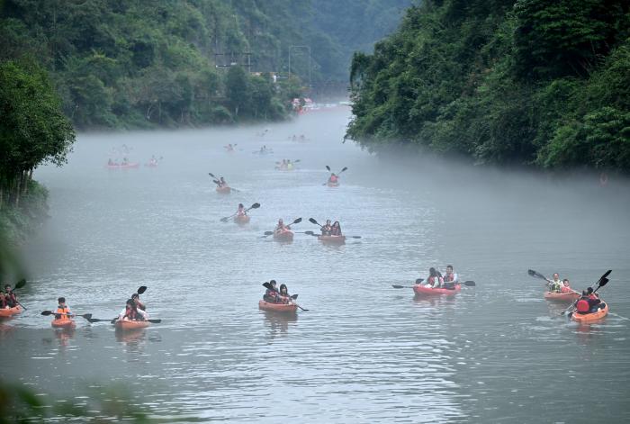 10月3日,游客在湖北省宣恩县狮子关景区的湖上戏水游玩。新华社发(宋文摄)