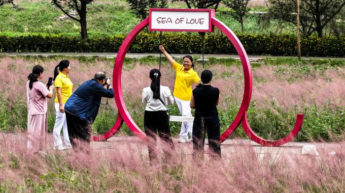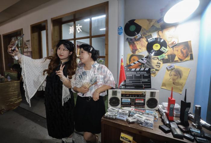 10月3日,游客在浙江省建德市更楼街道更化创意社区内自拍。新华社记者 徐昱 摄