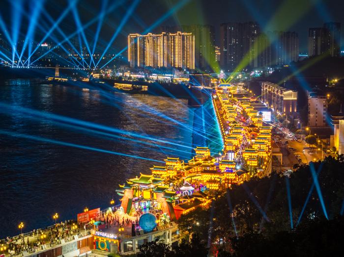 10月2日晚,游客在四川省广安市游玩(无人机照片)。新华社发(张国盛摄)