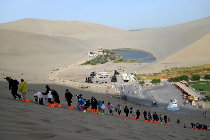 10月3日,游客在甘肃省敦煌市鸣沙山月牙泉景区游览。新华社发(张晓亮摄)