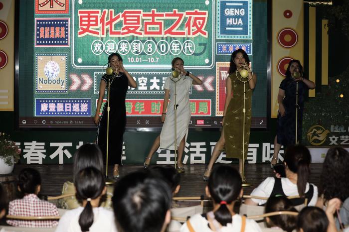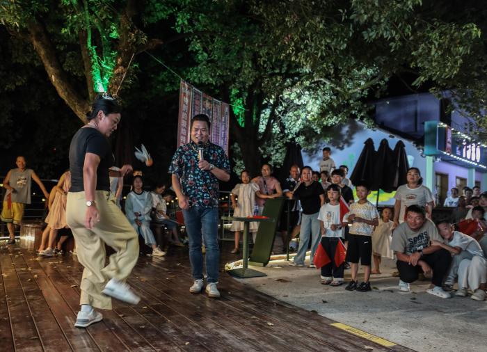 10月3日,游客在浙江省建德市更楼街道更化创意社区内观看表演。新华社记者 徐昱 摄